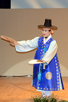 在日同胞の趙良葉さん(76)がピンク色の鮮やかなチマ・チョゴリと淡いオレンジ色のトゥルマギ姿で、愼玉熹さん(65)がカッ(笠)をかぶった両班の正式な衣装で登場すると、舞台がぱっと華やいだ。韓国民謡が流れる中、愼さんは扇子を操りながら、韓国舞踊も披露した。2人に観客から大きな拍手が送られると、笑顔でこたえた。