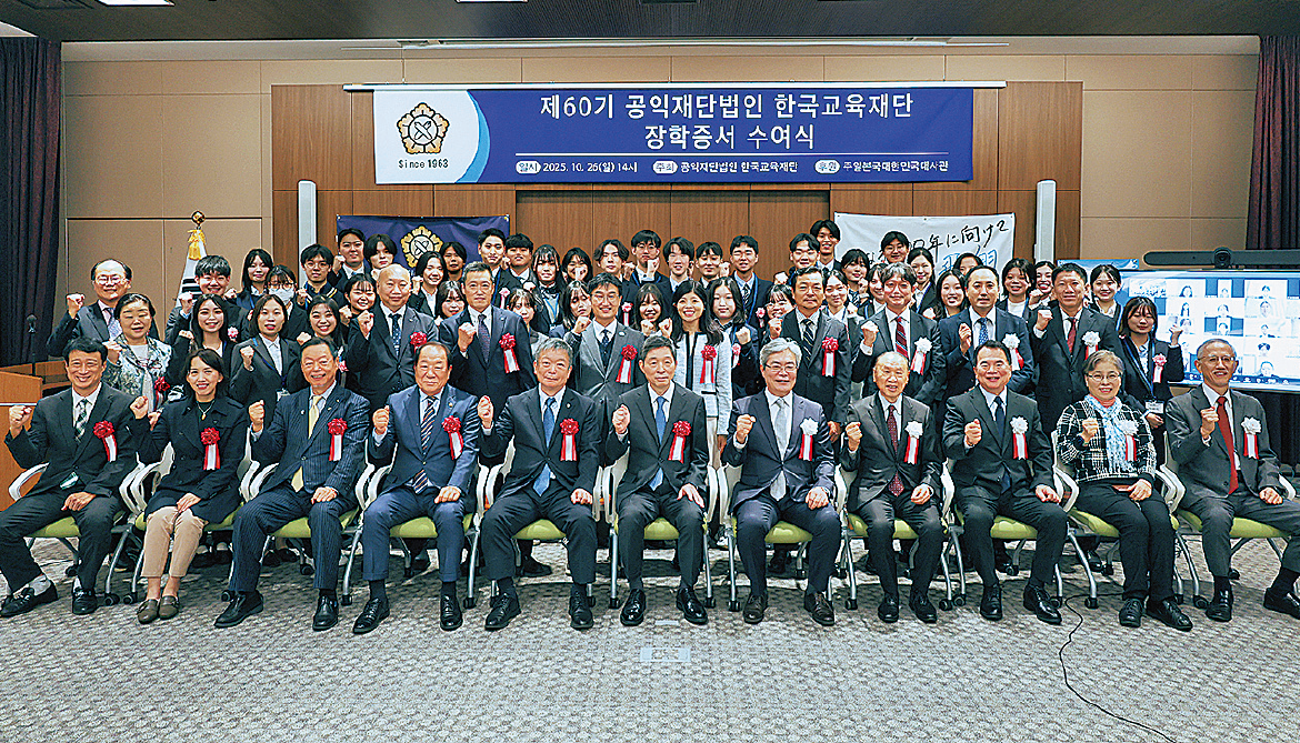 韓国教育財団(徐東湖理事長)は10月26日、駐日韓国大使館で「第60期奨学証書授与式」を開催した。東京、大阪などから奨学生、保護者、教育関係者ら140人がオンラインとオフラインを通じて参加した。今年度は、高校生20人、大学生60人、大学院生10人の計90人が奨学生として選抜。支給額は、高校生10万円、大学生50万円、大学院生100万円、さらに世界の名門大学MBA(経営管理学修士)課程に進学する「碧夆奨学生」には最大1200万円が支給される。