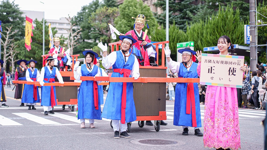 まつり2日目の10月19日のパレードで、金栄官民団同本部副団長が扮する「雨森芳洲」を先頭に金総領事の「正使」、李団長の「副使」が輿を連ねた。