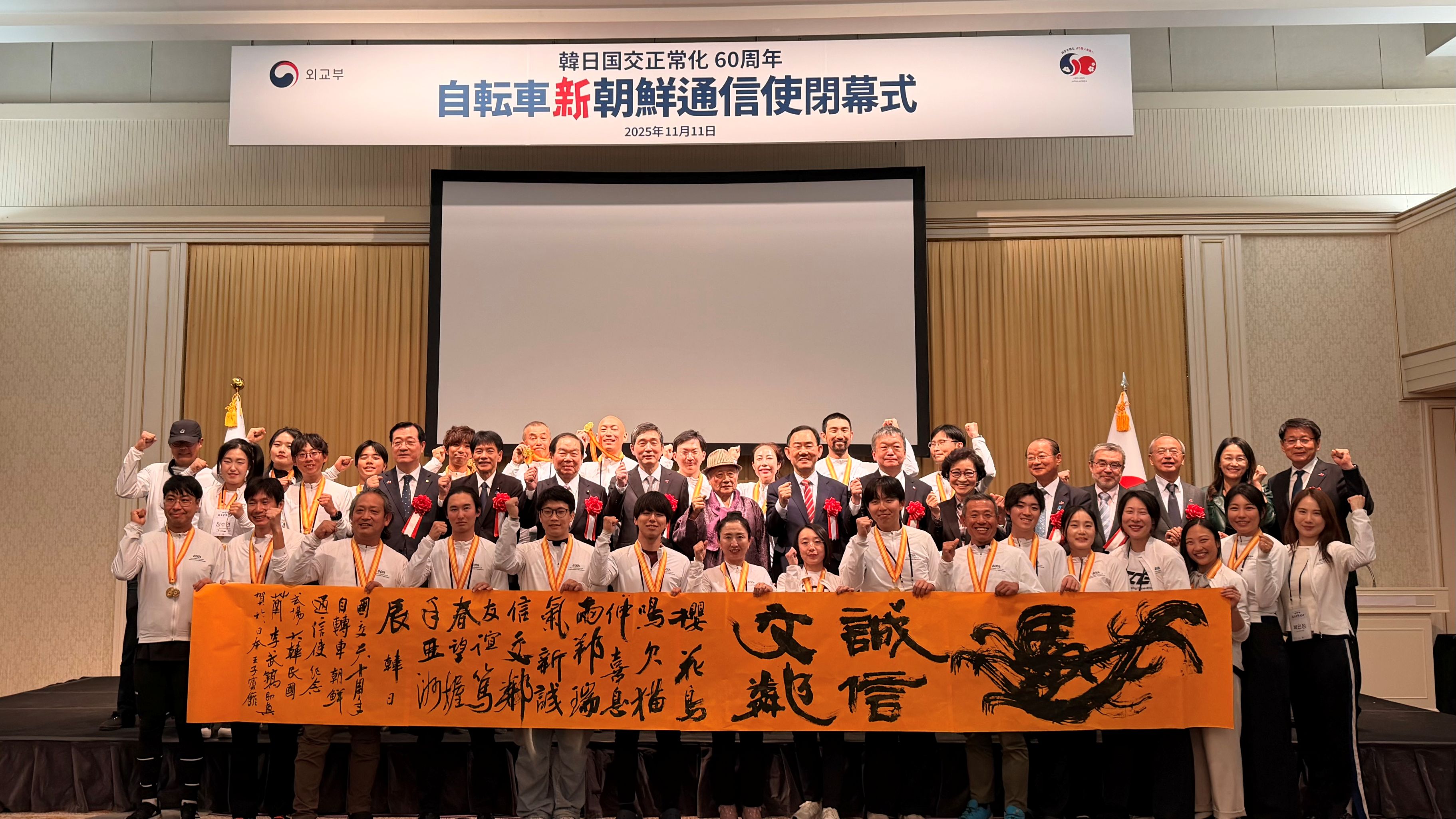 参加者らは10月27日にソウルの汝矣島を出発し、釜山を経て、フェリーで山口県の下関にわたり、大阪、京都、名古屋、静岡などを経てこの日ゴールした。船や自動車を利用した区間を除いた自転車での移動距離は780キロを超えた。