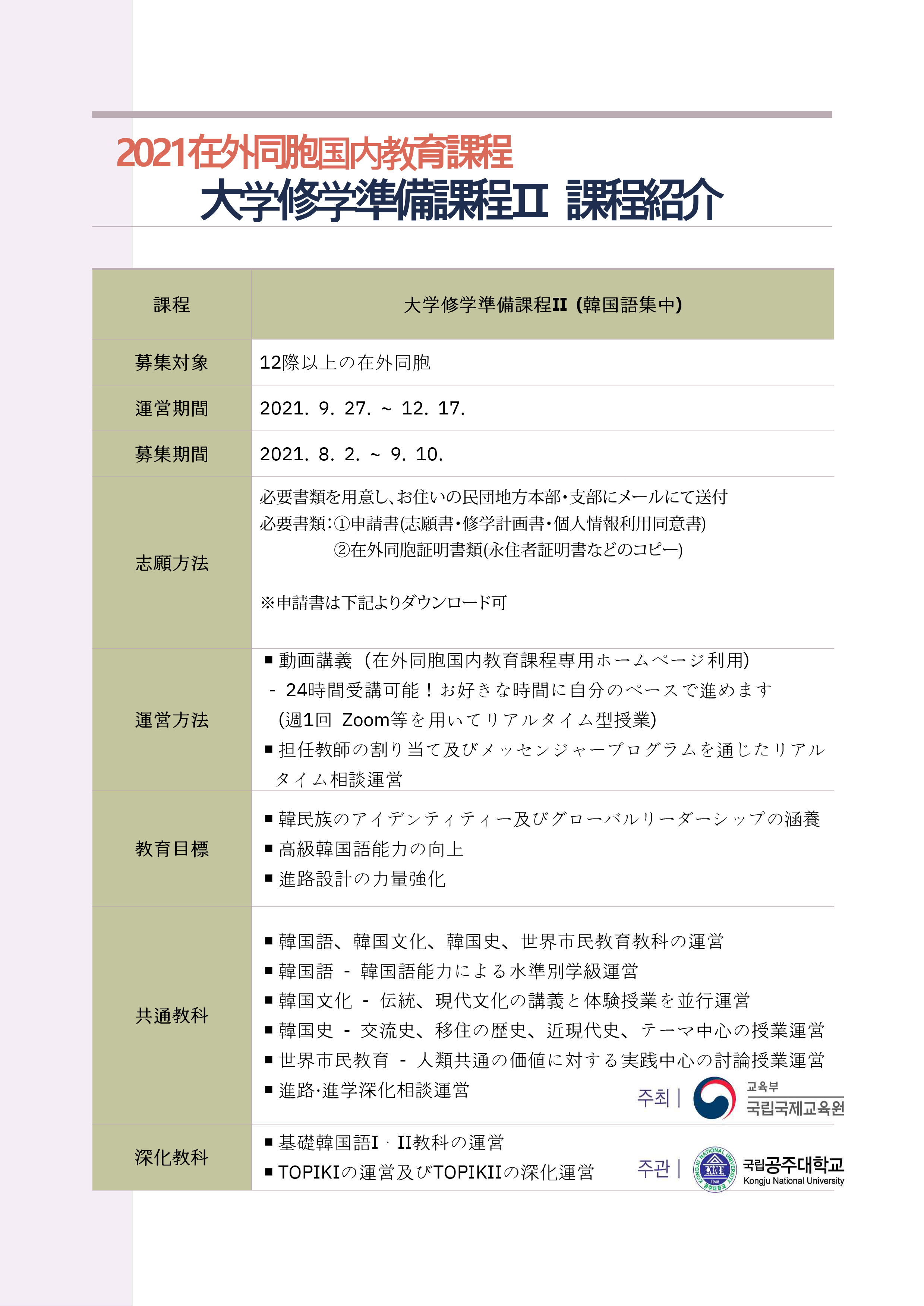 ≪2021 在外同胞 国内教育課程(母国修学) 大学修学準備課程Ⅱ≫ 追加 募集
