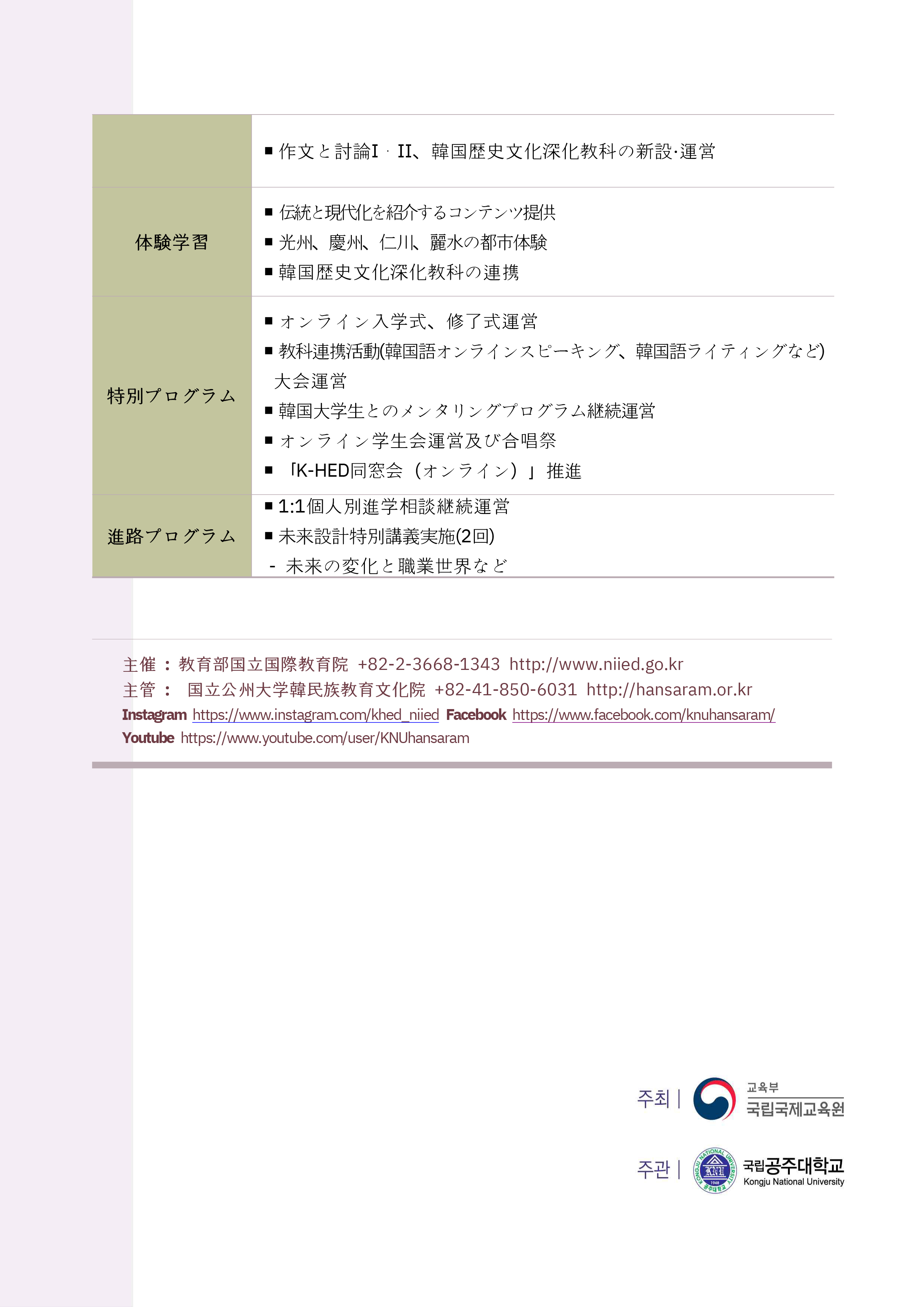母国理解に必要な基本的な韓国語のコミュニケーション能力の習得と、韓国の歴史と文化を学び、韓民族としての幅広い知識を身に付けることを目的にこの教育課程制度があります。国際社会で活躍する人材を育成するために国立国際教育院が主催する「2021 在外同胞 国内教育課程(母国修学)」の活用を積極的にご検討下さい。