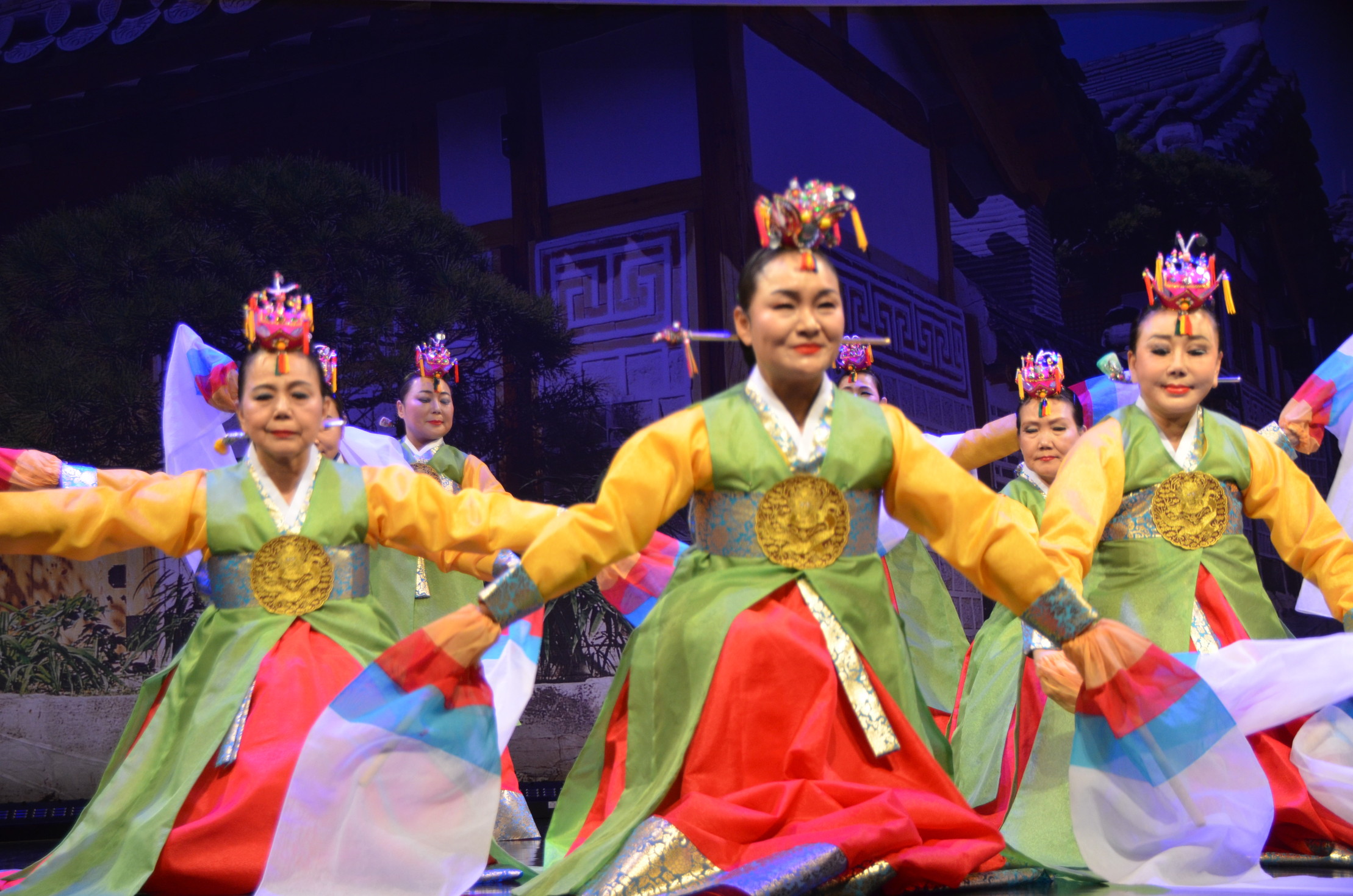 サムルノリ「初級」グループははじめのうちこそ緊張で固い表情を見せていたが、ケンガリを演奏する李昌燮さんの巧みなリードに安心したのか、笑顔で演奏を楽しんだ。「中級」は「ソンバンソルチャンゴ」で舞台いっぱいに躍動。舞踊教室のメンバーは宮中の王様の前で披露する優雅な「花冠舞」を披露した。