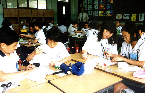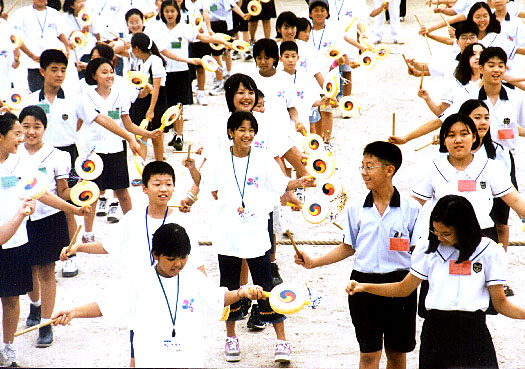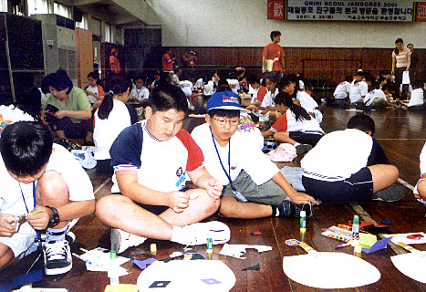 「本国の児童と共作」 本国児童と一緒に伝統うちわづくりに 励むオリニ(ソウル教育大学付属初等学校で) |