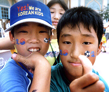 「フェイスペイント初体験」 頬にW杯のペイントをしてもらって得意げにガッツポーズ(エバーランドで) |