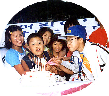 「ハッピバースディ」 誕生ケーキのロウソクを吹き消し、 記念品をもらったオリニ(フェアウェル・パーティー) |