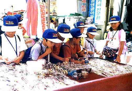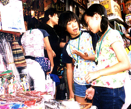 「興味津々」 「これ良くない」とおみやげを選ぶ視線も真剣そのもの(南大門市場で) |