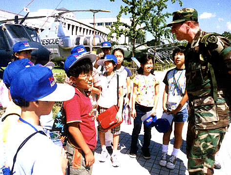 戦争記念館で会った米軍さんと「アイム・コリアン」と語り合うオリニ |