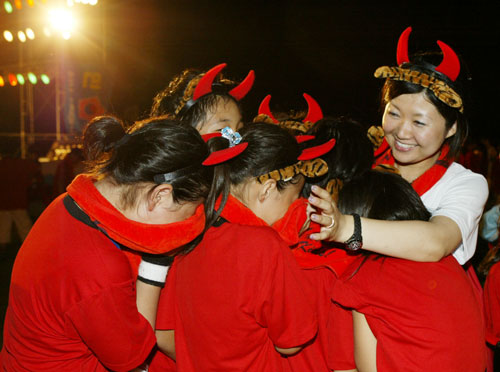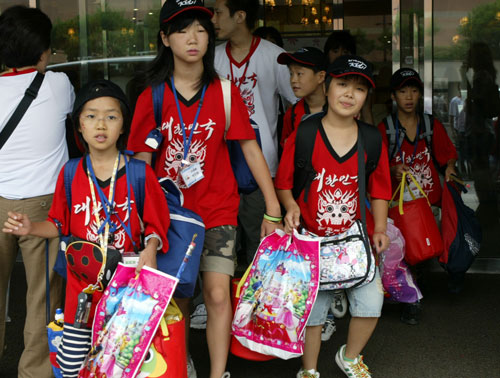 宿舎到着後、トッケビと「テハンミング」が描かれた、ユニホームの赤いTシャツを着てウェルカムパーティに向かうオリニ(8/6) | |||