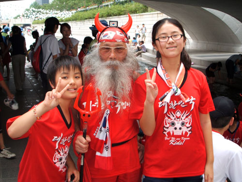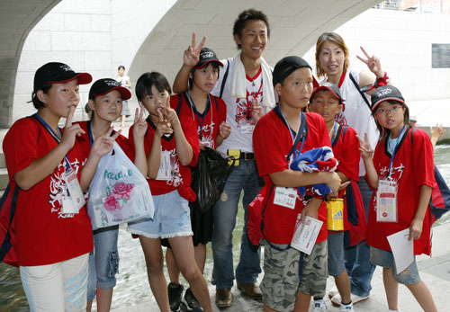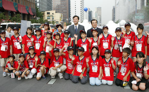 ゴールの清渓広場には呉世勲ソウル市長(後列中央左側)も激励にやってきました (8/7 ソウル市内スタンプラリー) |