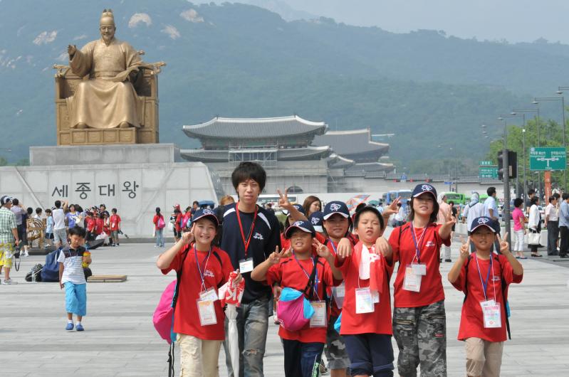 「世宗大王様だ!ハングルについて語っているのかな?」(8/2 光化門広場) |