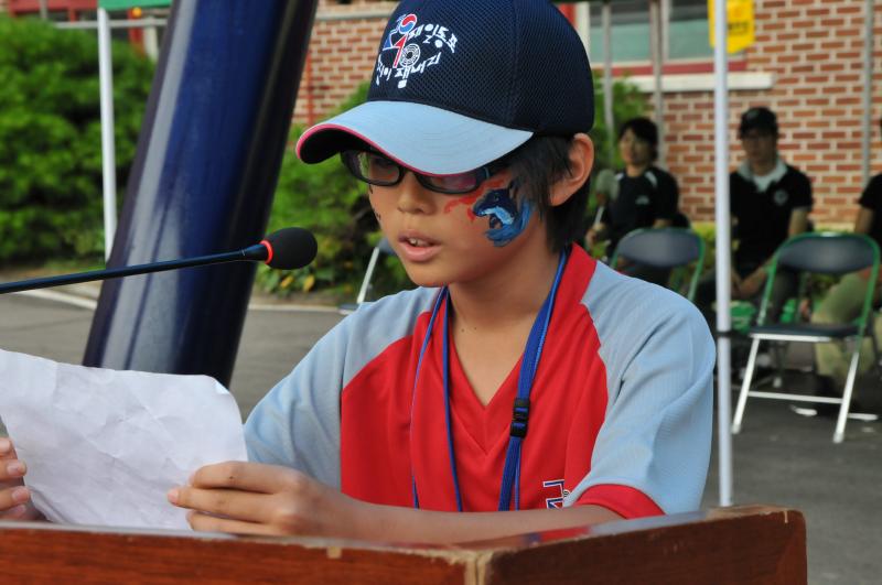 児童会長が歓迎のあいさつ(8/3 長丞初等学校) |