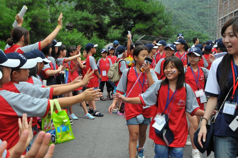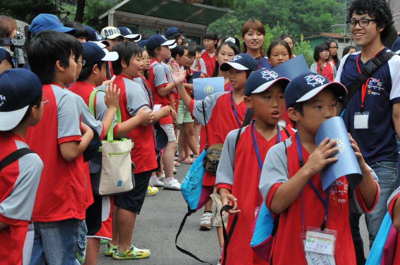 温かく迎えてくれた長丞のチングたちに在日同胞オリニたちもにっこりあいさつ(8/3 長丞初等学校) |