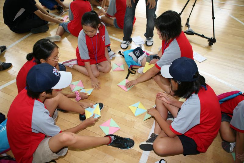 パートナーと一緒に教室ではプチェ(扇)作りを楽しみました(8/3 榛接初等学校) |