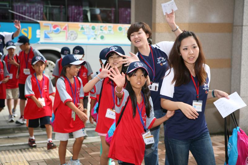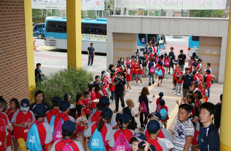 楽しかった時を終え、バスに乗り込む在日同胞オリニ(8/3 榛接初等学校) |
