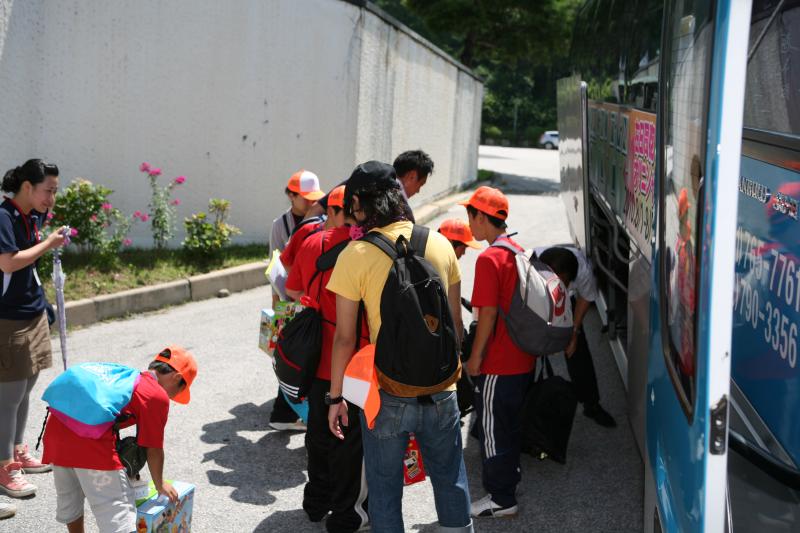 楽しかった思い出の宿所をあとにバスに向かうオリニとリーダー(8/5 ベアースタウン)