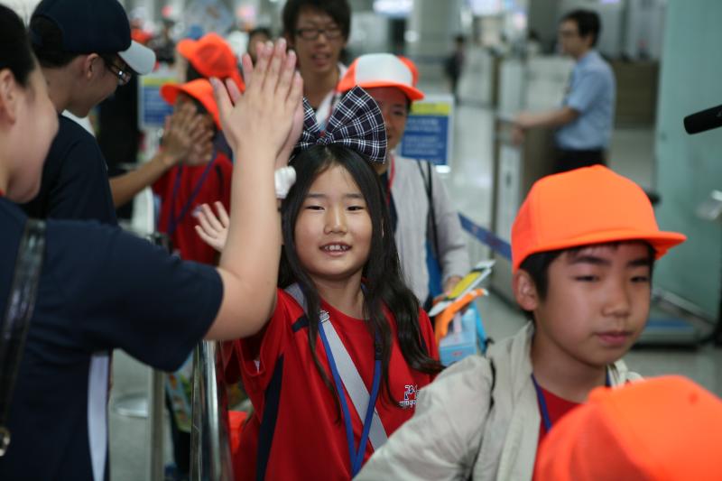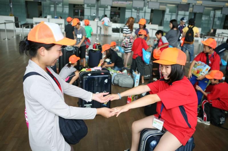 リーダーやスタッフと別れのハイタッチをするオリニ(8/5 仁川空港)