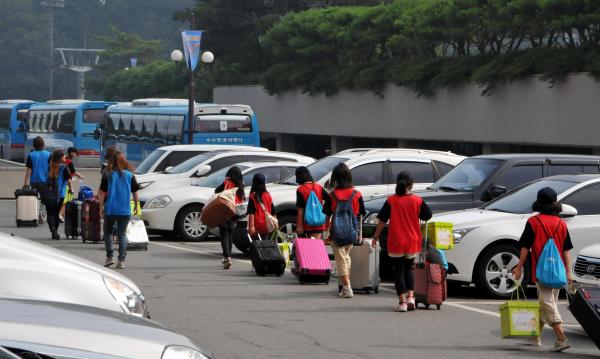 | 空港行きのバスに向かうオリニたち。その背中姿は少し寂しそう |
