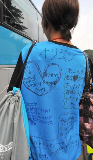 | リーダーのTシャツにはオリニたちが思い出たっぷりの寄せ書きが |