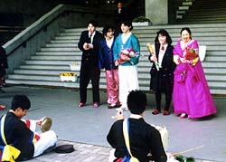 | 民族衣装で巣立つ先輩を 在校生がサムルノリを演奏して祝福した |