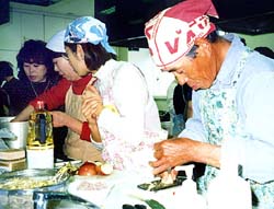 婦人会静岡県本部(金末順会長)の会員らを講師に迎え、キムチとビビンパの二品に挑戦した。金会長からキムチ作りの説明が行われ、「韓国ではよく梨を使う」という話に参加者たちから「へぇー」という声も。婦人会のメンバーが下準備を終えた材料を運び込み、指導にあたった。