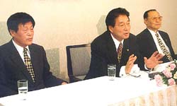 | 記者会見で抱負などを述べる新三機関長 (左から、姜永祐議長、金宰淑団長、洪性仁監察委員長) |