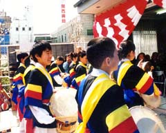 この日の式典では、御幸森小学校の民族学級で学ぶ新6年生11人がサムルノリを演じて竣工を祝った。