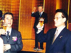 | | 乾杯する崔相龍大使(左)と金宰淑団長(右) |