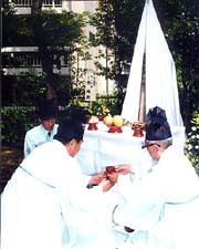 墓石前にナツメ、クリ、ナシ、カキの四種類の果物とともに餅などが並べられ、祭祀用の韓服を身につけて一人ひとりが王酒という特別な酒を捧げながら墓石を故郷へ返還することが報告された。