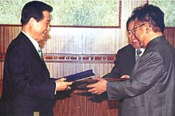 南北首脳会談後自らが署名した 「南北共同宣言」を交換する金大中大統領(左) と金正日国防委員長(右) |