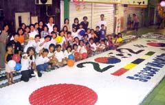 【三重】ドミノで2002W杯をアピール。日本テレビの人気番組「ズームイン朝」の特別番組として放送される「ドミノバトル2000」に四日市市一番商店街と千葉県のユーカリが丘商店街が出場することになり、四日市一番商店街の依頼を受けた民団三重県本部(姜勝煕団長)がW杯をモチーフにしたドミノを見事に成功させた=写真=。