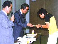| 同胞高校生に奨学金を 手渡す姜会長(中央) |