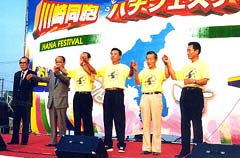 鄭、車両会長のあいさつに続いて、民団の黄昌柱・神奈川県本部団長、ソウ在龍・川崎支部支団長と総連の金佑鍾県本部委員長、李漢洙川崎支部委員長の6人が特設ステージ壇上で手を握り合い、高く掲げた。来賓の高橋清川崎市長も壇上で「南北首脳会談がベルリンの壁崩壊に匹敵するような歴史的一歩になることを願う。今回のフェスティバルを契機に共生の町づくりの草の根の活動がいっそう広がるよう期待したい」と激励した。