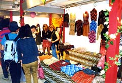 2坪足らずのブースがずらりと並んだ各フロアは、さながらフアッション見本市の様相。10代の女性はスパンコールやビーズをあしらったポシェットを前にして「チョーカワイイ」と歓声。衣料品もパッチワークをアクセントに配したものなどに注目が集まっていた。