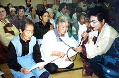 集会室に勢揃いしたお年寄り70人余りを前に金会長は、「秋にもう一度おうかがいしたいとの約束が実現しました。皆さんとおしゃべりで楽しく過ごしたい」とあいさつ。全員に冬物のソックスをプレゼントした。メンバー10人は、韓国民謡「ミリャンアリラン」の音楽テープに合わせ、チマをひるがえしながら舞い踊って見せた。すると、踊りに合わせて見よう見まねで手を動かすお年寄の姿も見られた。