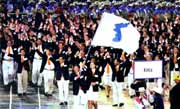 | 韓半島旗を先頭に手を 握り合って入場行進する 南北選手団 |