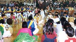 この日の式典では、民族学級で学ぶオリニと国際理解教育で韓国の文化を学ぶ日本人の児童が一緒になって韓国の歌、踊りなどを発表した。