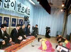 【大阪】金剛学園(李大燦校長)が23日、同校に近隣の公立小2校と西大阪朝鮮初級学校(李英敏校長)から児童を招待、一緒になって名節「ソルナル(民俗の日)」を祝った。韓国の伝統的習慣と作法を体験することで「韓国の心」を学んでもらおうと、同学園が10年前から行っている行事。今回、初めて朝鮮学校生徒を招いた。