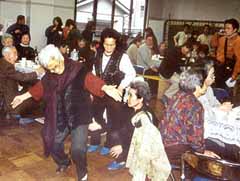 各テーブルにはふれあい館に集う若い世代が、焼き肉やナムル、お餅などのごちそうを用意して並べた。お年寄りはビールやマッコリを手に歓談した。