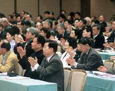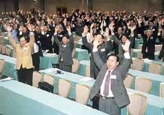 | 決議文を満場一致で 採択する参加者 |