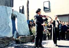 作品は2人の「瞬時の決断」に心を動かされた千葉市在住の日本人彫刻家、山田光造さん(55)が事故の報に接した直後から制作に取りかかり、1カ月余りかけて私費で完成させた。アーチ状に組み合わせた2つの石は「2人の勇気」に対する感謝の念を表しているという。