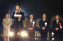 オープニングであいさつする 民団大阪府本部の金昌植団長 (後列は左から太田府知事、中川元府知事、 総連大阪府本部の呉秀珍委員長、 磯村大阪市長) |
