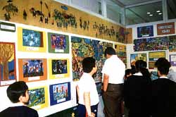 東京韓国学園は初等部の5年生6人が制作に参加した「朝鮮通信使行列図」(和紙、長さ4・5メートル)や韓国の伝統美、風俗図に題材をとった中・高校生の作品に注目が集まっていた=写真=。