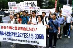集会後、参加者800人が「外国人住民の地方参政権を実現させるぞ」などのシュプレヒコールを繰り返しながらデモ行進。国会通りから桜田門を通り、文部科学省前ではひときわ高く教科書検定に抗議の声をあげた。ゴールとなった衆・参議員面会所では出迎えた民主党と社民党の議員に約40万人にのぼる国会請願署名を手渡した。
