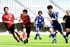 | 闘志あふれるプレーを見せた 在日大韓蹴球団(赤いユニホーム) |