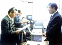 川崎市教育委員会に「つくる会」 教科書不採択の要望書を手渡す ゙在龍 民団川崎支部支団長(左) |