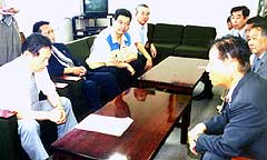 小山市の菅沼教育長(左)に 採択見直しを迫る民団代表 |