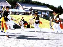韓国の堤川市の民族舞踊団がケンガリ、チャンゴ、ドラなどを打ち鳴らしながら賑やかな農楽を披露した。