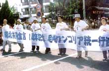金節子婦人会尼崎支部会長は「今までお互いよそよそしかったが、これを機に今後も交流できたらいい」と喜んだ。李団長によると、昨年の南北共同宣言以来、幹部の相互交流は着実に実を結んでおり、今回のパレードには民団、総連双方100人ずつの計200人が参加した。