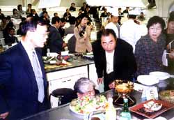 今年のテーマ料理は、「フェ(刺身)」(2種類・2点)、「チャプチェ(雑菜)」、「豆腐料理」の3種類。調理段階の一挙一動を見過ごすまいと各テーブルを取り囲むように立った見学者も真剣そのもの。競技開始と同時に参加者たちは手際良く下ごしらえに取りかかり、段取りよくアイデアと工夫に富んだ料理を完成させていた。